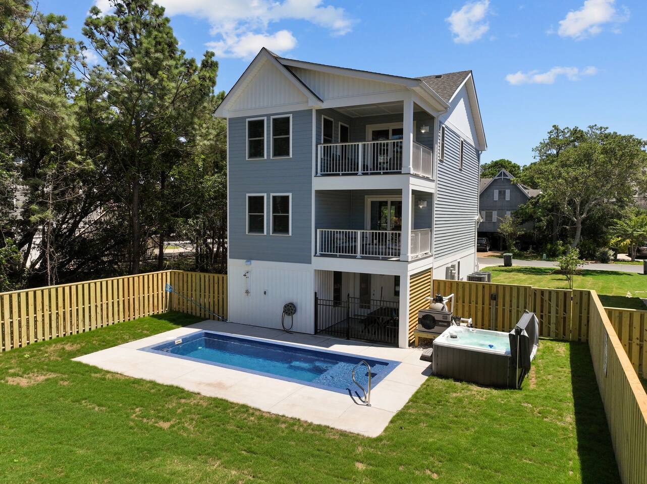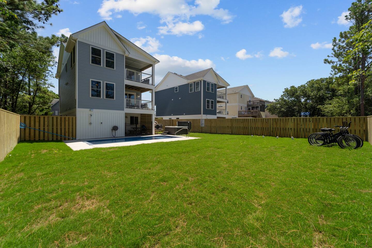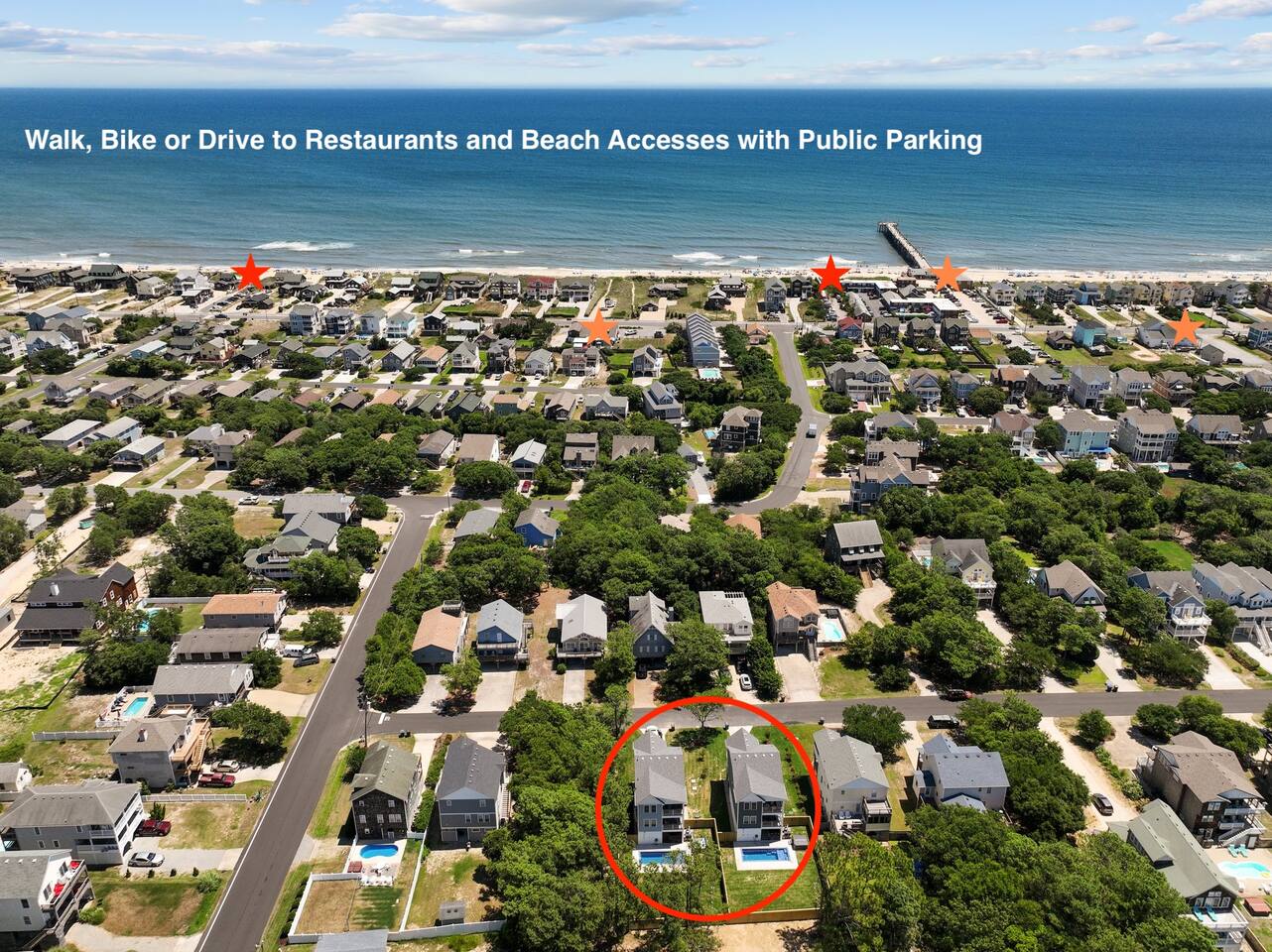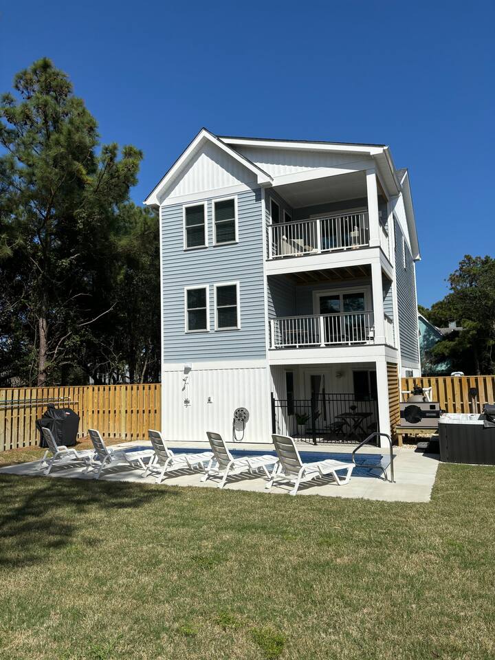 Need more space?! This property has a neighboring "twin cottage" called 'Park and Paddle'. Pool is OPEN April 25 - October 28th. Hot Tub is OPEN year-round, > Both are professionally maintained twice a week. >> Pool heat available for an additional fee. << LIMITED TIME OFFER ask us about FREE pool heat with your September or October stay. Escape to Coastal Bliss: Nags Head Retreat with Pool, Game Room, and Private Suites! Only .4 or 8 minute walk or 2 minute drive to the ocean access via Bainbridge Street or Nags Head Fishing Pier. Indulge in luxury crafted by Simpleside Construction, renowned for their award-winning craftsmanship. Relax in style with chic furnishings curated by Site to Sea Interior Design. Unwind in the serene ambiance of Nags Head, boasting tranquil surroundings and easy access to local dining, shopping, and idyllic beaches for fishing, surfing, or simply soaking up the sun. With ample living space, fenced yard, and top-notch amenities including a hot tub and video arcade, this coastal haven promises an unforgettable retreat for your family's enjoyment. Your dream vacation awaits in this coastal paradise! Where we 🌟 Shine 🌟: * NEWLY Built in 2024 on Beach Side of Nags Head * Only a .4 or 8 minute walk or 2 minute drive to the ocean access. Amble parking in Nags Head. * Easy Walkability to Nags Head Pier, Dowdy Park - Restaurant and Ice Cream! * Fully Stocked with gear for you to spend time together, cook or relax. * Baby Gear, Board Games and Bikes Available! * All beds and pillows are fully-encased part of our high-standard of cleanliness. 🌿 Discover coastal luxury at its finest in this Nags Head retreat boasting a pool, game room, private suites, and chic furnishings, providing the ultimate haven for relaxation and enjoyment. 🌿 Nestled in the heart of Nags Head, this coastal retreat epitomizes luxury living with its array of amenities and stylish touches. From the moment you arrive, you'll be captivated by the allure of the private pool, perfect for refreshing dips under the sun's warm embrace. Step inside to discover a thoughtfully designed game room, offering endless entertainment with shuffleboard and a video arcade game, ensuring fun-filled evenings for the whole family. As night falls, retire to one of three private suites, each exuding comfort and tranquility, providing a peaceful sanctuary after a day of coastal adventures. Whether you're lounging in the hot tub, soaking up the sunshine in the fenced yard, or exploring the nearby beaches and local attractions, this vacation home offers an unparalleled retreat where cherished memories are made against the backdrop of Nags Head's coastal beauty. Experience the epitome of coastal living and create unforgettable memories with your loved ones in this exquisite Nags Head retreat. Book your stay now and embark on a journey of relaxation, adventure, and pure bliss by the sea. Your dream vacation awaits! Included in your stay: ✔ Linens for Each Bed ✔ Bath Towels Provided ✔ First Roll of Paper Products ✔ Hand Soap ✔ Dish Soap and Pods ✔ Trash Bags ✔ Laundry Detergent (4 pods) 📣Stay with an experienced and creditable host! We have a great attention to detail, paired with 10 years of Hosting and Super Hosting experience. 📣Parking Space for MAX 4 Vehicles in the driveway. Please only park in the driveway to avoid ticketing. 📣Spacious Fenced Yard with Pool and Hot Tub! Three levels of decking and THE INTERIOR SPACE: ✔ Strong Wi-Fi ✔ Laundry Room w/ Washer + Dryer (Detergent Provided) ✔ Fully Supplied Kitchen KITCHEN ✔ Fully-Equipped Kitchen ✔ Stove and Oven ✔ Fridge + Freezer ✔ Toaster ✔ Kitchen Knife Block Set ✔ Cutting Board ✔ Ninja Coffee Maker ✔ Hot Water Kettle ✔ Dishes ✔ Silverware ✔ Glasses ✔ Wine Glasses ✔ Coffee Mugs LIVING ROOM // DINING - TOP LEVEL ✔ Sofa ✔ Love Seat ✔ Coffee Table ✔ Throw Pillows + Blankets ✔ Board Games ✔ Smart TV ✔ Dining Table with Seating for 6 ✔ Breakfast Bar/Island Seating for 4 THE SLEEPING ARRANGEMENTS | King Bedroom | ♛ 1 Bedroom w/ 1 King Bed ♛ Bed Linens, Quilt, Throw Blanket and 4 Pillows Per Bed ♛ 40in Smart TV EN-SUITE BATHROOM ✔ Full Bathroom Located in Bedroom w/ Shower ✔ Amenities Provided: Hair Dryer, First Toilet Paper Roll HALF BATHROOM | Mid Stairs ✔ Half Bathroom Located off of the Living Room ✔ Amenities Provided: First Toilet Paper Roll LIVING ROOM//LAUNDRY - SECOND LEVEL ✔ Sofa ✔ Coffee Table ✔ Throw Pillows + Blankets ✔ Smart TV ✔ Location of GE Stackable Washer and Dryer THE SLEEPING ARRANGEMENTS | King Bedroom | ♛ 1 Bedroom w/ 1 King Bed ♛ Bed Linens, Quilt, Throw Blanket and 4 Pillows Per Bed ♛ 40in Smart TV EN-SUITE BATHROOM ✔ Full Bathroom Located in Bedroom w/ Shower and Bathtub ✔ Amenities Provided: Hair Dryer, First Toilet Paper Roll THE SLEEPING ARRANGEMENTS | KING Bedroom | ♛ 1 Bedroom w/ 1 King Bed ♛ Bed Linens, Quilt, Throw Blanket and 4 Pillows Per Bed ♛ 40in Smart TV EN-SUITE BATHROOM ✔ Full Bathroom Located in Bedroom w/ Shower and Bathtub ✔ Amenities Provided: Hair Dryer, First Toilet Paper Roll LIVING ROOM//GAME ROOM - GROUND LEVEL ✔ Sofa ✔ Coffee Table ✔ Throw Pillows + Blankets ✔ Smart TV THE SLEEPING ARRANGEMENTS | BUNK ROOM | ♛ 1 Bedroom w/ 2 Twin Beds as a Bunk Bed ♛ Bed Linens, Quilt, Throw Blanket and 4 Pillows Per Bed ♛ 40in Smart TV SHARED GROUND LEVEL BATHROOM ✔ Full Bathroom Located in Bedroom w/ Shower ✔ Amenities Provided: Hair Dryer, First Toilet Paper Roll THE SLEEPING ARRANGEMENTS | King Bedroom | ♛ 1 Bedroom w/ 1 King Bed ♛ Bed Linens, Quilt, Throw Blanket and 4 Pillows Per Bed ♛ 40in Smart TV 🛍️ Neighborhood + Amenities Near Downtown Manteo – 10.7 miles away ☕ Coffee Shops + Cafés Morning View – 0.8 miles away Waveriders – 0.4 miles away 🛒 Grocery Stores Fresh Market – 3.1 miles away Food Lion – 1.1 miles away Publix – 4.5 miles away 🍦 Ice Cream + Treats Surfin